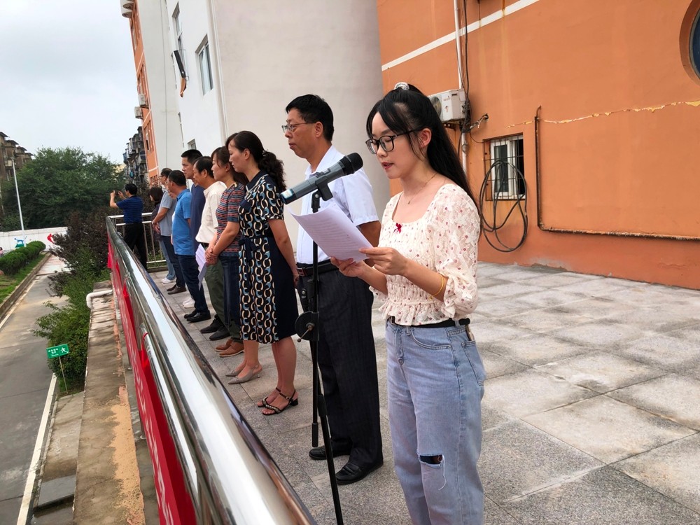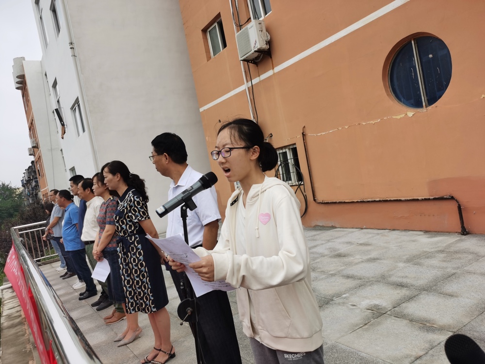 伴着雄壮的国歌声,五星红旗冉冉升起,全体师生肃立注目,开学典礼拉开了帷幕。本校区学生代表905班的李舟潇潇同学、教师代表小学教导处的朱成成老师和西校区学生代表高二(6)班武玉宁同学、教师代表黄丽雪老师分别发言,他们号召全体师生以全新的精神面貌投入到学习生活中去,自觉做好疫情防控工作,做好安全监督员、做环保卫士、做健康达人,做学习的主人,努力成为更好的自己。