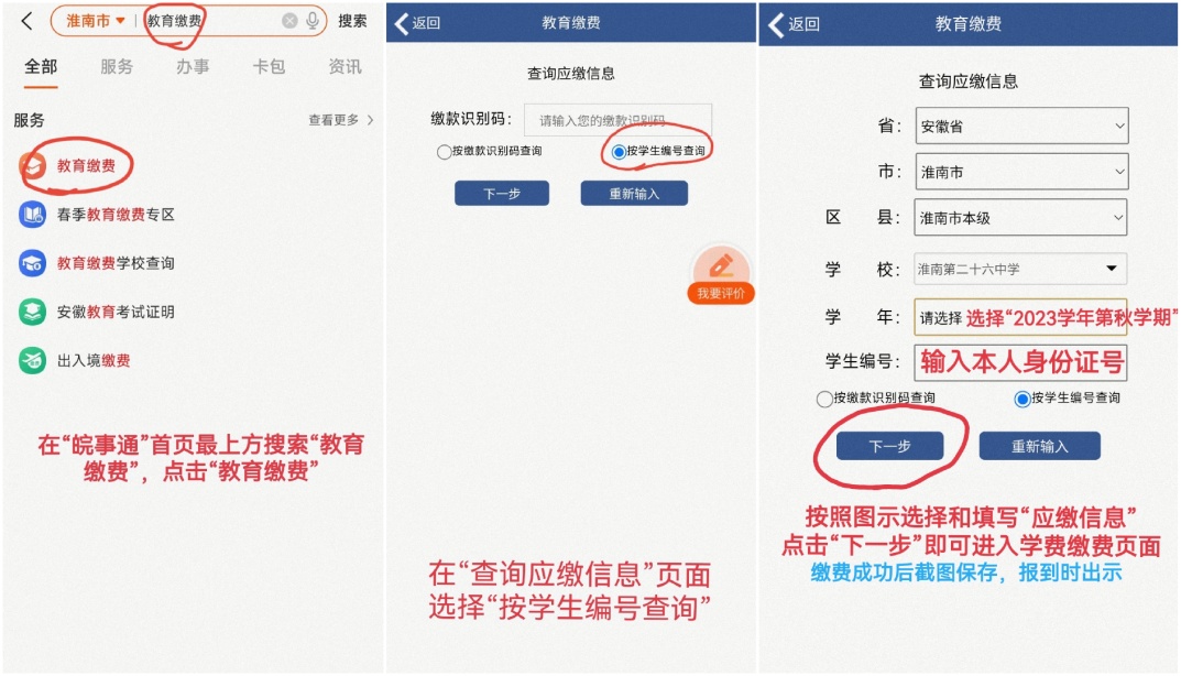 缴费办法:在“皖事通”首页最上方搜索“教育缴费”,点击“教育缴费”进入“查询应缴信息”页面,在“查询应缴信息”页面选择“按学生编号查询”,然后选择和填写信息,核对无误后点击下一步完成缴费。缴费成功后截屏保存。