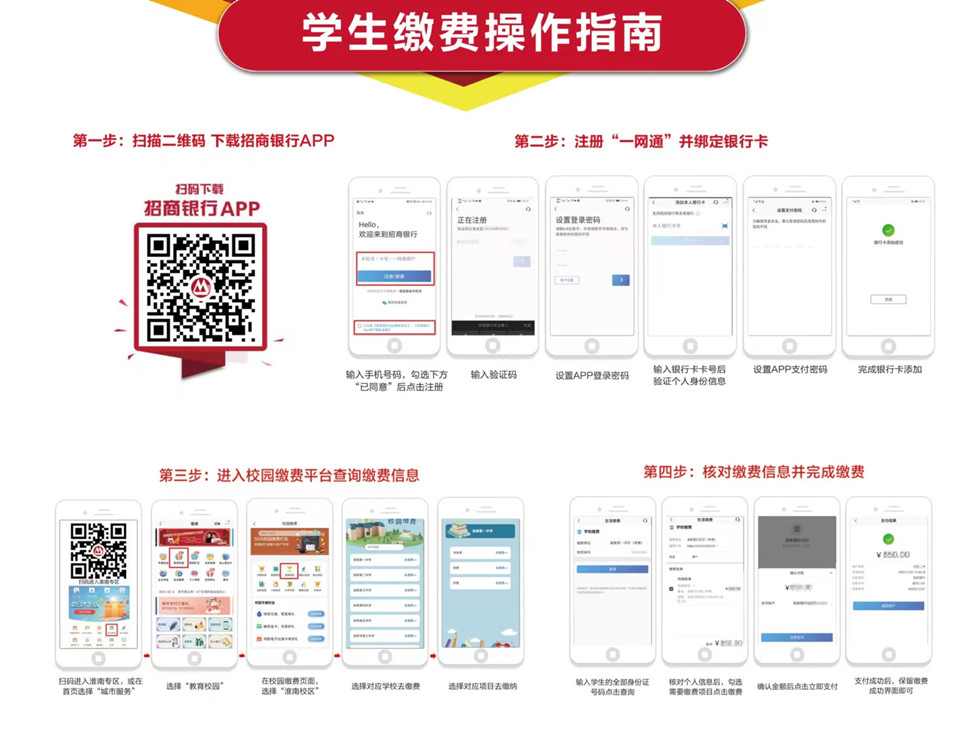 缴费办法:请家长在手机上下载招商银行APP,注册并绑定家长本人名下的银行卡。招商银行APP登录后,在首页找到“城市服务”,切换到淮南,然后选择“教育校园”,在校园缴费页面选择“淮南校区”,下拉找到“淮南第二十六中学”后分别点击“书本费缴费”、“校服费缴费”,输入缴费号码,即学生本人的身份证号码,完成缴费。缴费成功后分别截屏保存。