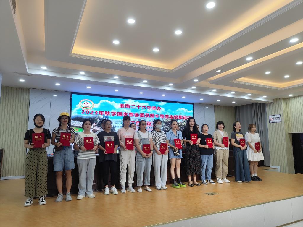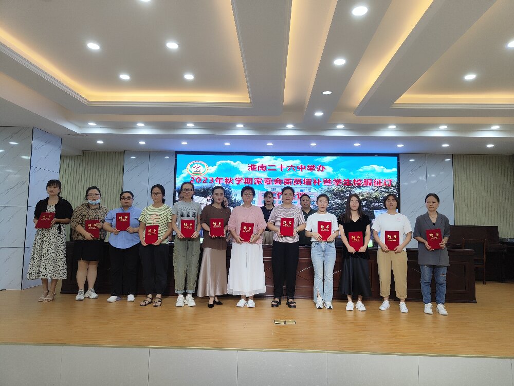 会议伊始,德育主任蔡瑞霞宣读淮南二十六中关于增补家委会常务主任、委员的决定。接着,学校领导为增补的学校家委会常务主任以及家委会委员颁发荣誉证书并合影留念。