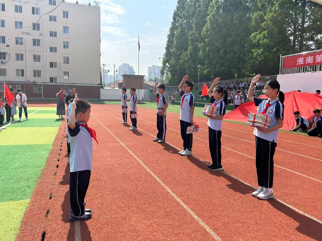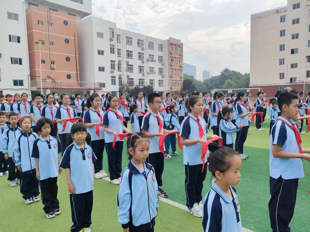 入队是一个新的起点,是一次新的启航。大队辅导员徐静雅老师宣读新入队队员名单后,六年级少先队员代表庄重地把红领巾系在新队员的胸前。这飘扬在胸前的红领巾,不仅是少先队员身份的光荣象征,更是引领着新队员不断前进的火炬。