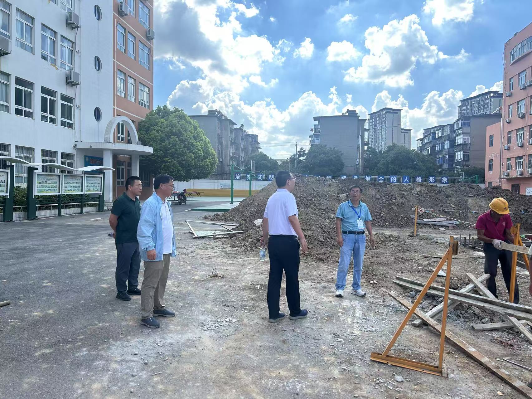7月24日下午,市教体局领导张晓明、项目管理中心主任杨传和、董文祺一行,冒着酷暑深入淮南二十六中暑期工程现场,专项督查指导我校初中楼消防改造工程和小学教室地面维修改造工程。校总务处副主任唐传来及相关负责人陪同。